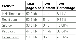 The Content-to-Code ratio : Want to know how heavy your homepage is? Now, you can. Here’s a super application called GetContetSize made by Adrian Holovaty. It calculates the ratio of text content to total page size for a given Web page. It’ll strip all the HTML, Javascript, CSS code, and determine how much of the document is actual text.