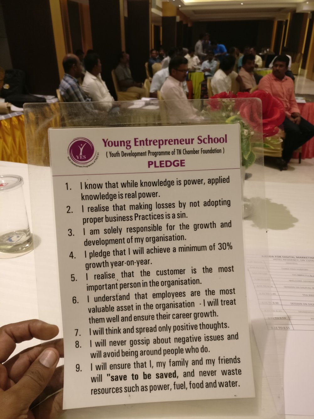 Young Entrepreneur School (YES) is an organiztion which aims to encourage entrepreneurship. They have multiple chapters in smaller towns in Tamilnadu for they believe that these places lack opportunity and knowledge.