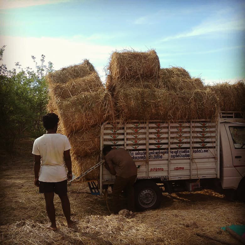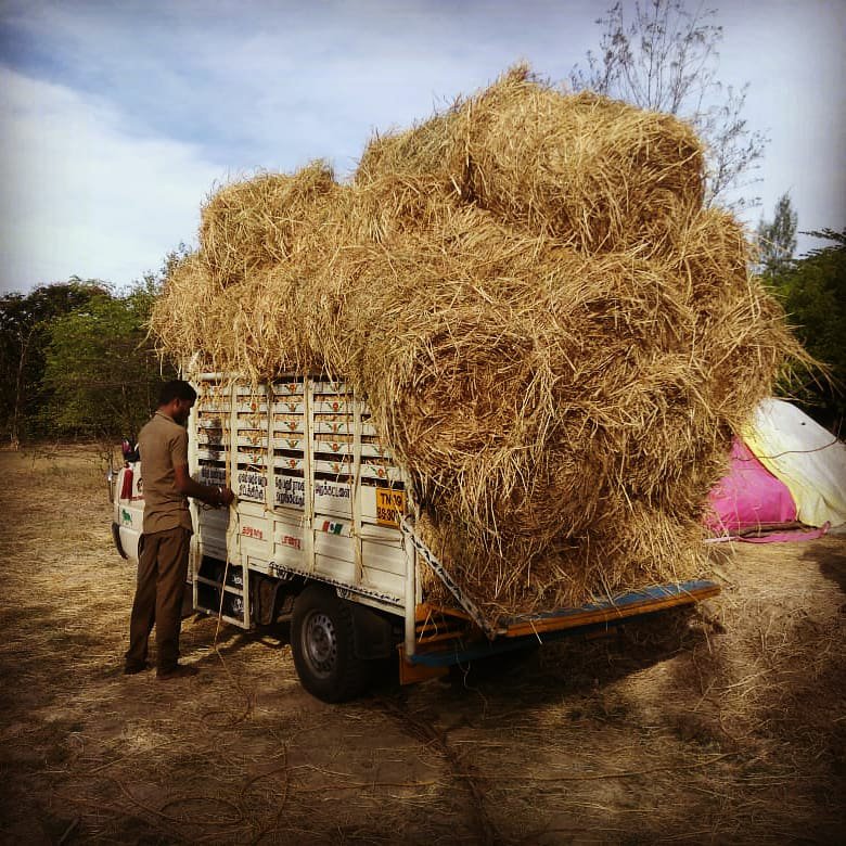 With severe summer and lack of rains, there is no grass for our cows to graze here at Vaksana Farms. Hence, we are forced to buy hay which becomes the main source of food for them. The hay is exorbitantly priced as the demand is high and supply is low. Thankfully a friend of my Dad recently harvested paddy and he donated a van load of hay for the cows. Bless his heart.