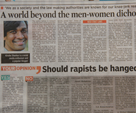 As a father of two daughters, I really want them to grow in a society that respects women and gives them a place to be their own. I would like to paraphrase my friend Vijay Anand who elucidates clearly, “I am ashamed that even in this century we draw such dividing lines, between a man and a woman – and somehow a man has to acknowledge that women are equals. Women are equal whether men admit it or not.” I would go one step further in hoping that there comes a time soon when we stop looking at us as men and women and start respecting each other as human beings.