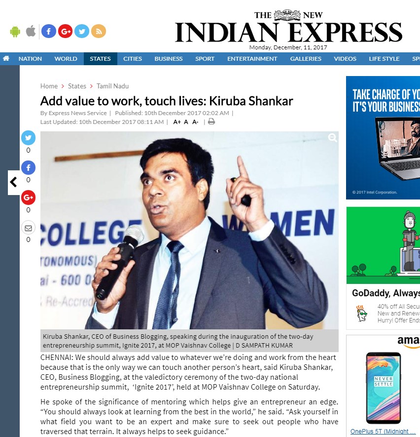 CHENNAI: We should always add value to whatever we’re doing and work from the heart because that is the only way we can touch another person’s heart, said Kiruba Shankar, CEO, Business Blogging, at the valedictory ceremony of the two-day national entrepreneurship summit, ‘Ignite 2017’, held at MOP Vaishnav College on Saturday.
