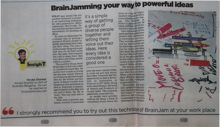 With such a positive ambiance created, it motivates even the most reticent folks to come up and talk about their idea. I recently had the opportunity to host a BrainJam on innovation at Proto.in at IIT Delhi along with Amit Somani, the head of Search and Products at Google India. The response pleasantly surprised me.