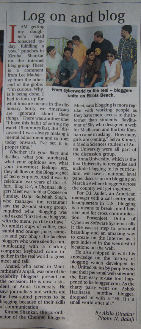 Kiruba Shankar, the co-ordinator of the Chennai Bloggers meet, says blogging is more regular with working people as they have more access to the Internet than students. Ravikumar of Sify who designed a website for Madhavan and Karthik Kannan came in asking, “How many girls are coming.” Selva Kumar, a Media Sciences student of Anna University were all part of the discussion group.