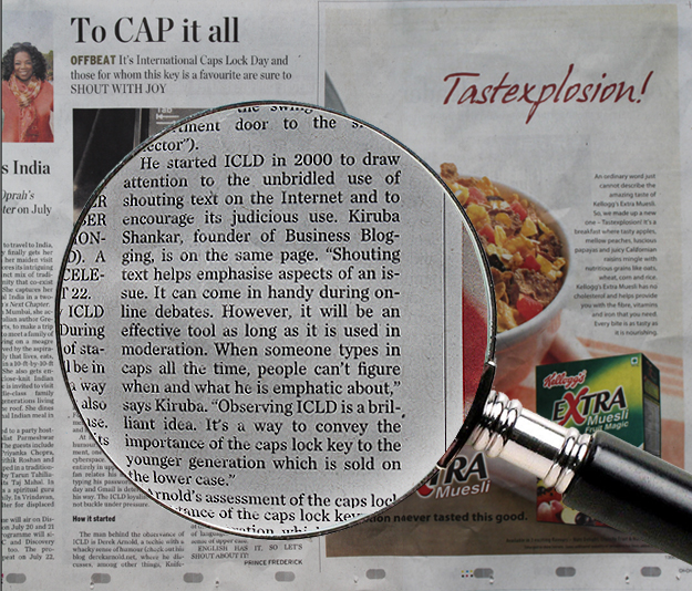 He started ICLD in 2000 to draw attention to the unbridled use of shouting text on the Internet and to encourage its judicious use. Kiruba Shankar, founder of Business Blogging, is on the same page. “Shouting text helps emphasise aspects of an issue. It can come in handy during online debates. However, it will be an effective tool as long as it is used in moderation. When someone types in caps all the time, people can’t figure when and what he is emphatic about,” says Kiruba. “Observing ICLD is a brilliant idea. It’s a way to convey the importance of the caps lock key to the younger generation which is sold on the lower case.”