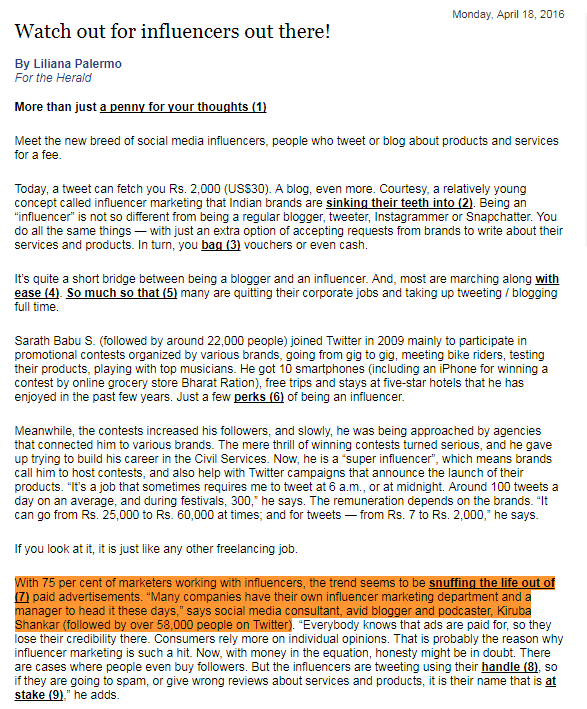 With 75 per cent of marketers working with influencers, the trend seems to be snuffing the life out of (7) paid advertisements. “Many companies have their own influencer marketing department and a manager to head it these days,” says social media consultant, avid blogger and podcaster, Kiruba Shankar (followed by over 58,000 people on Twitter). “Everybody knows that ads are paid for, so they lose their credibility there. Consumers rely more on individual opinions. That is probably the reason why influencer marketing is such a hit. Now, with money in the equation, honesty might be in doubt. There are cases where people even buy followers. But the influencers are tweeting using their handle (8), so if they are going to spam, or give wrong reviews about services and products, it is their name that is at stake (9),” he adds.