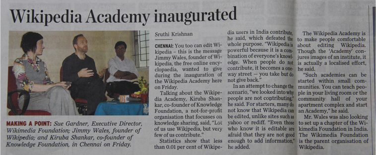 You too can edit Wikipedia – this is he message Jimmy Wales, founder of Wikipedia, the free online encyclopaedia, wanted to give during the inauguration of the WIkipedia Academy here on Friday. Talking about the WIkipedia Academy, Kiruba Shankar, co-founder of Knowledge Foundation, a not-for-profit organisation that focuses on knowledge sharing said, “Lot of us use Wikipedia, but very few of us contribute.”